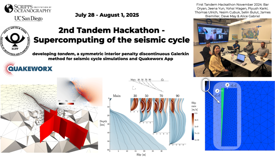 We’re excited to announce the second Tandem - Supercomputing of the Seismic Cycle Hackathon, taking place July 28 - August 1, 2025, at the Scripps Institution of Oceanography, UC San Diego, with generous support from the Green’s Foundation at IGPP.